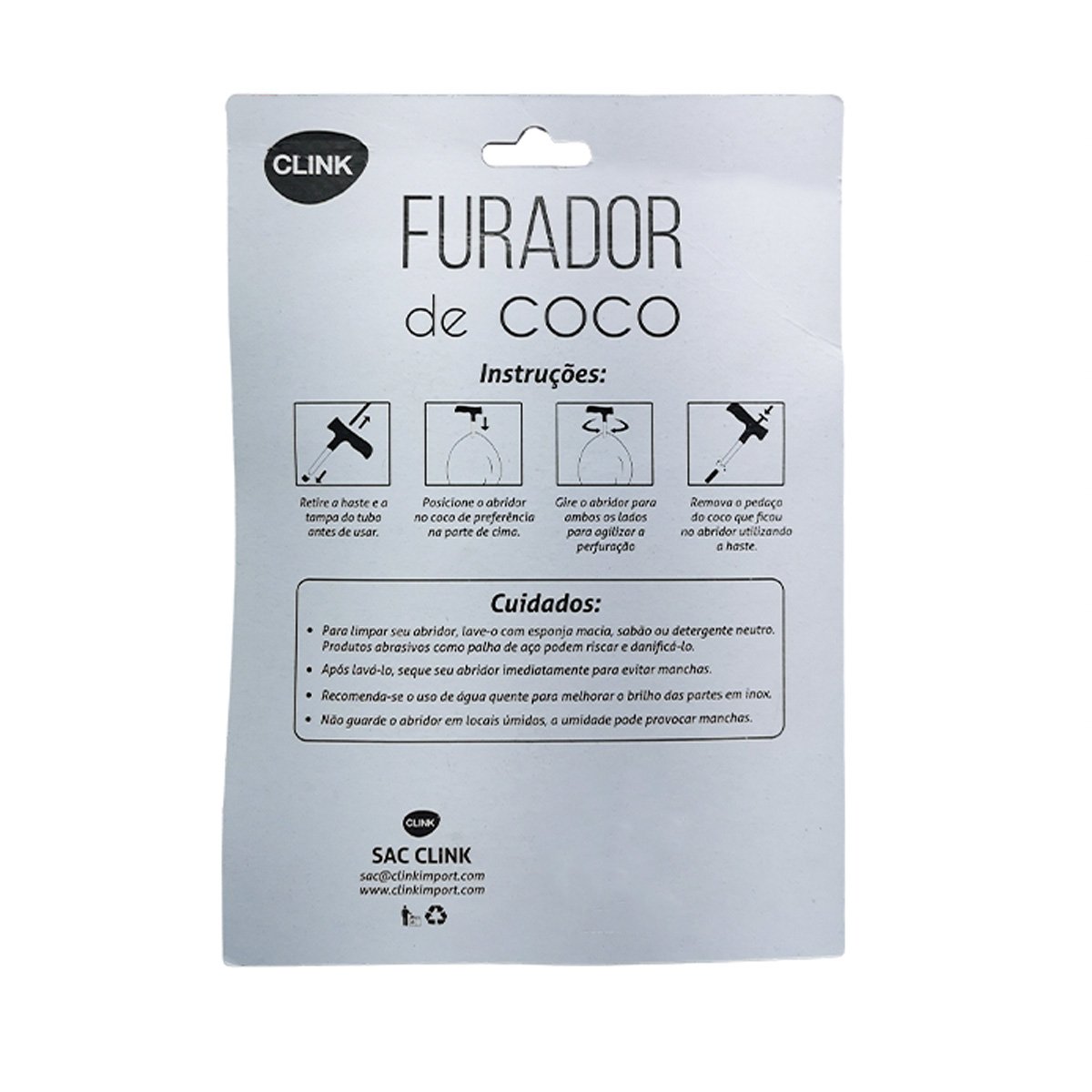 Seu design ergonômico facilita o manuseio e proporciona uma perfuração precisa, sem esforço. O material inoxidável evita ferrugem e torna a limpeza simples, assegurando maior durabilidade ao produto. Compacto e portátil, é o companheiro perfeito para quem adora consumir água de coco fresca e natural.